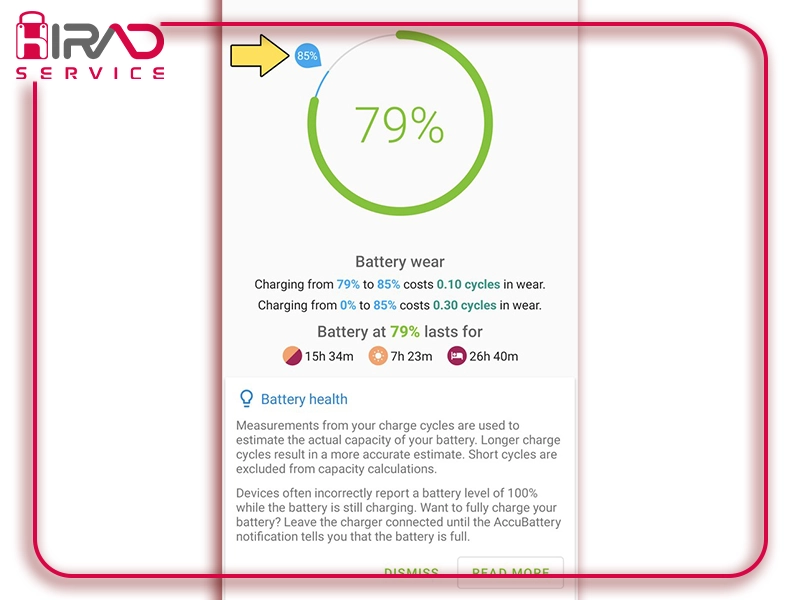 اگر عدد ظرفیت به زیر ۸۰٪ رسیده باشد یا پیغام Service نمایش داده شود، یعنی زمان تعویض باتری فرا رسیده است.